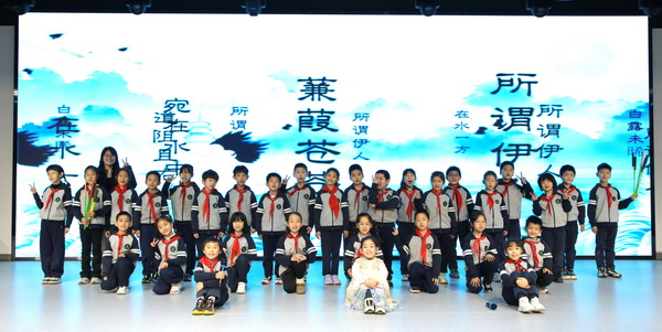二年級一班的同學(xué)們率先登場,以真摯的吟誦演繹《蒹葭》。孩子們的嗓音清亮悠遠,將“溯洄從之,道阻且長”的縹緲追尋展現(xiàn)得淋漓盡致,讓在場觀眾仿佛置身于朦朧的意境中,贏得陣陣掌聲。