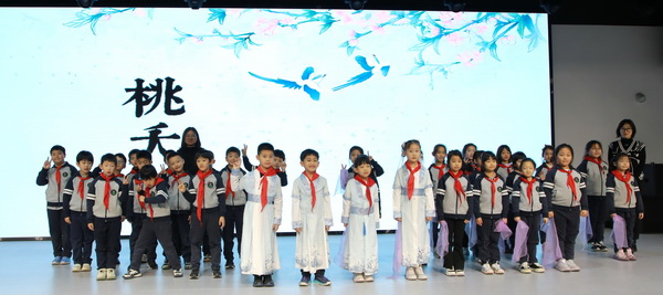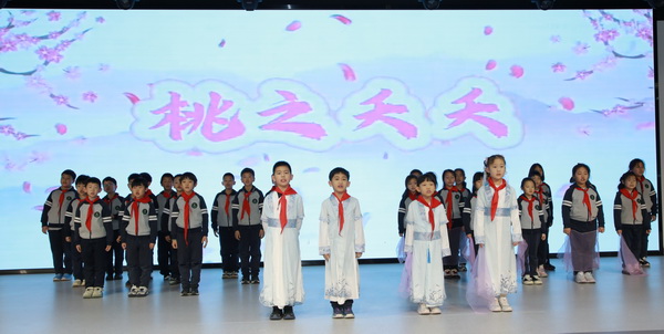 二年級2班帶來了明快的歡歌《桃夭》。小演員們搭配靈動的手勢動作,用甜美的嗓音吟誦“桃之夭夭,灼灼其華”,將桃花盛開的爛漫圖景與新生的美好喜悅傳遞給每一位觀眾,現(xiàn)場氛圍愈發(fā)熱烈。